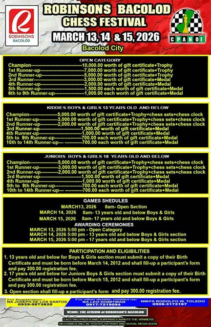 Susulong na ang Robinsons Bacolod Chess Festival mula Marso 13, 14, at 15, 2026 sa Atrium, Robinsons Bacolod.