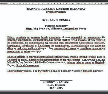 Pinagkalooban ng "Gawad Huwarang Lingkod Barangay" ni Barangay Balita Ngayon (BBN) editor -in-chief Johnny Balani si Brgy. Chairman Alvin Zuniga ng Brgy. 183, Zone 20, Pasay City kahapon.