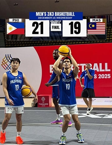 BANGKOK— Joseph Sedurifa played the hero’s role, booming in the game-winning deuce as the Gilas Pilipinas 3x3 men squad nipped Malaysia, 21-19, Wednesday to reach the semifinals of the men’s 3x3 basketball competition of the 33rd Southeast Asian Games at the Nimbutir Stadium here.