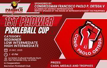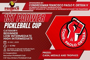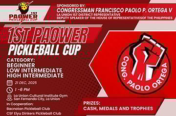 Laro na! Ang Unang Paower Pickleball Cup, na inisponsor ni Kinatawan Francisco Paolo P. Ortega V ng Unang Distrito ng La Union, ay puno ng kumpetisyon ang Gymnasium ng La Union Cultural Institute sa Lungsod ng San Fernando noong Disyembre 21, 2025, mula 1:00 ng hapon hanggang 6:00 ng gabi.