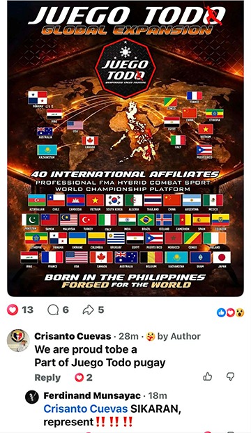 " Isang karangalan para sa ating Tanay Sikaran ang mapili bilang kinatawan ng bansa na sasabak sa Todo Juego.Buti na lang ay nakahabol tayo sa opisyal rehistrasyon.Salamat kay Chairman Munsayac.We are proud to be part of Juego Todo!", sambit ni Mantas Cuevas