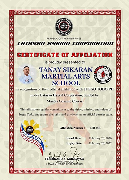 PINAGTIBAY ng Latayan Hybrid Corporation ang opisyal na affiliation ng Tanay Sikaran Martial Arts School na pinamumunuan ni Mantas Crisanto Cuevas sa prestihiyosong JUEGO TODO PH.