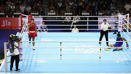 The Filipino Olympian unloaded a booming right hook and knocked out Vietnamese opponent Manh Cuing Nguyen to advance to the gold-medal match of the men’s 80-kilogram class in the 33rd Southeast Asian Games at the Chulalongkorn Sports Center on Wednesday, Dec. 17.