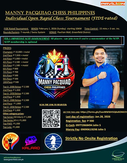 Ang mga baguhang kalahok sa Manny Pacquiao Chess Philippines Individual Open Rapid Chess Tournament (may FIDE rating) ay may pagkakataong makakuha ng FIDE Rating (pandaigdigang marka).