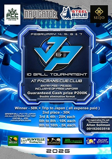 The J&P 10 Ball Cup 2026 , an amateur pool tournament is set to surge on February 4, 5, 6 & 7 at the newest and state-of-the-art pool hall Pacman's Cue Club, located at the Lower Ground Floor, World Wide Corporate Center, Shaw Boulevard. (Corner EDSA) in Mandaluyong City.