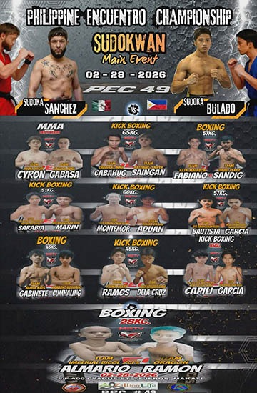 BABANDERANG main event ang dalawang magiting na mandirigma sa ruweda na sina Adrian Bulado ng Pilipinas kontra Ray ‘Armada Sanchez ng Mexico sa sudokwan main event ng Philippine Encuentro Championship - Search for more Filipino Heroes sa Pebrero 28,2026 sa Catalan Fighting System Gym, Yague St. Tejeros , Makati City.