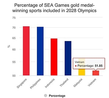 By percentage, Indonesia followed the Philippines and Singapore with just under 65 percent of its golds from Olympic sports, trailed by Thailand (64 percent), Malaysia (57 percent), and Vietnam (51.85 percent).
