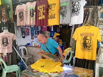 Puspusan na ang pag-imprinta ng mga t-shirt ni photog/con artist Edwin Belosillo ng larawan ng Mahal na Poong Nazareno na gawa sa silkscreen sa C.M Recto, Manila para sa mga deboto.