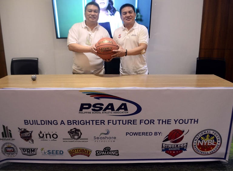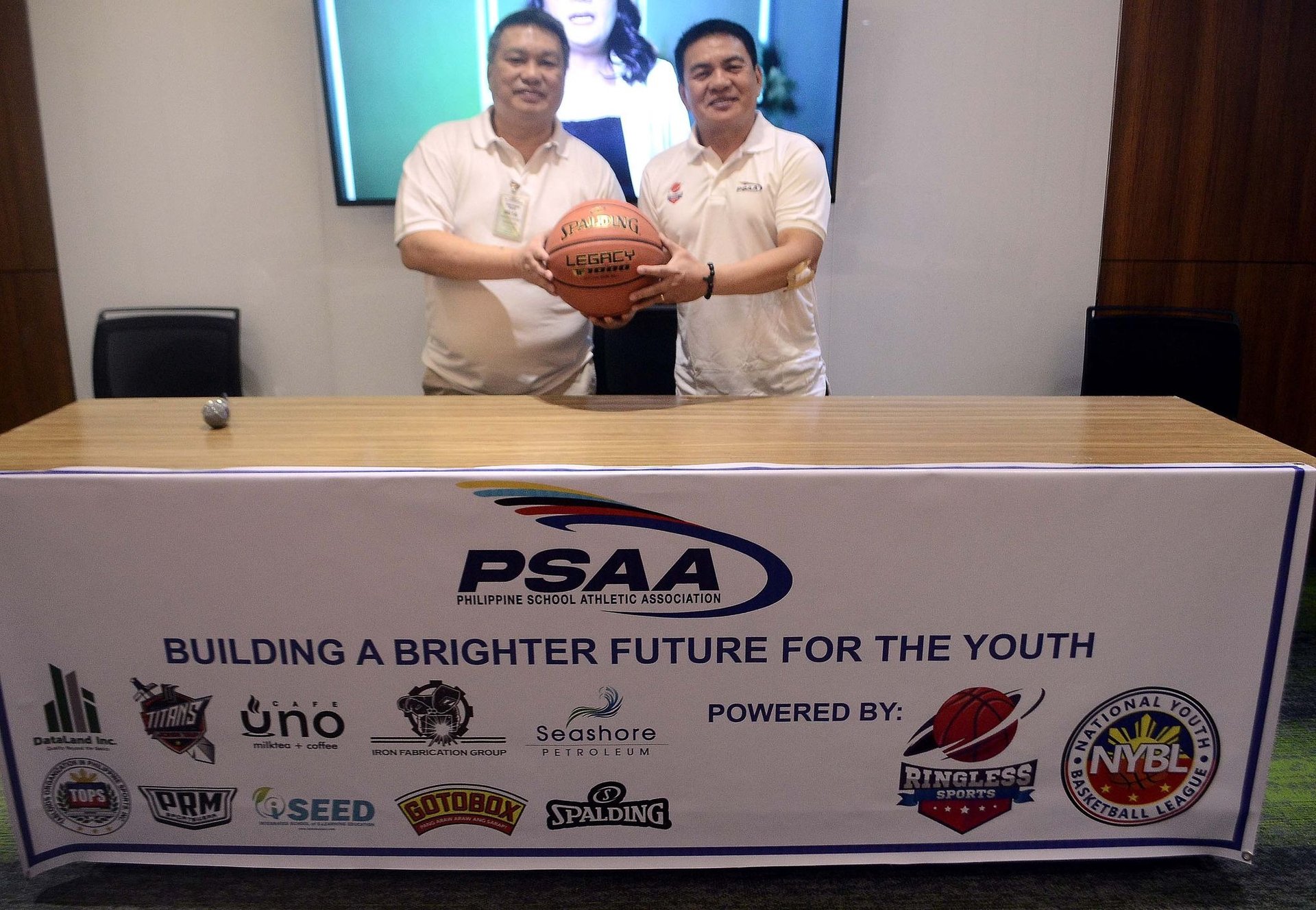 Senelyuhan ng PSAA at Spalding ang tambalan para sa pagsulong ng bagong liga sa pamamagitan nina PSAA founder Fernando Arimado (kanan) at Proline Sports Inc. vice president Joven Babaan