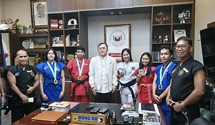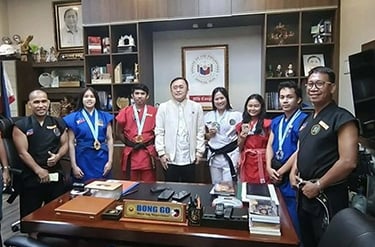 PINAPURIHAN at kinilala ni Sen.Christopher 'Bong Go ang mga atleta ng Pilipinas na nag-uwi ng gold-siver- bronze medals na sumabak kamakailan sa 1st WUSHU Combat WORLD Championship.na ginanap sa Labu-an ,Malaysia.
