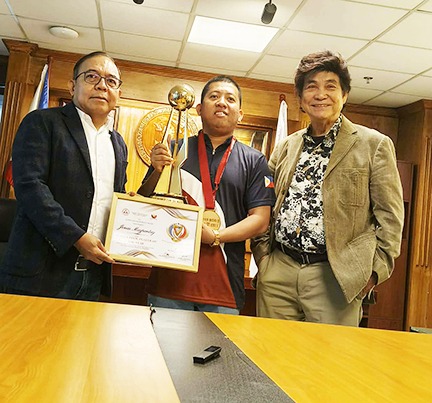 Si Games and Amusement Board (GAB) Chairman Atty. Francisco Rivera (sa kaliwa) at GAB Commissioner Angel Bautista (sa kanan) ay binati si Jonas Magpantay (sa gitna), matapos niyang manalo sa Qatar World 10 Ball Cup noong Nobyembre.